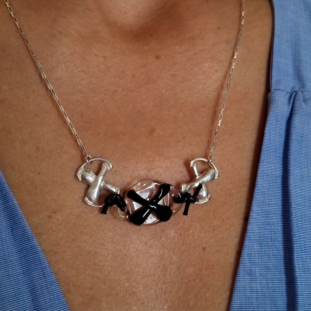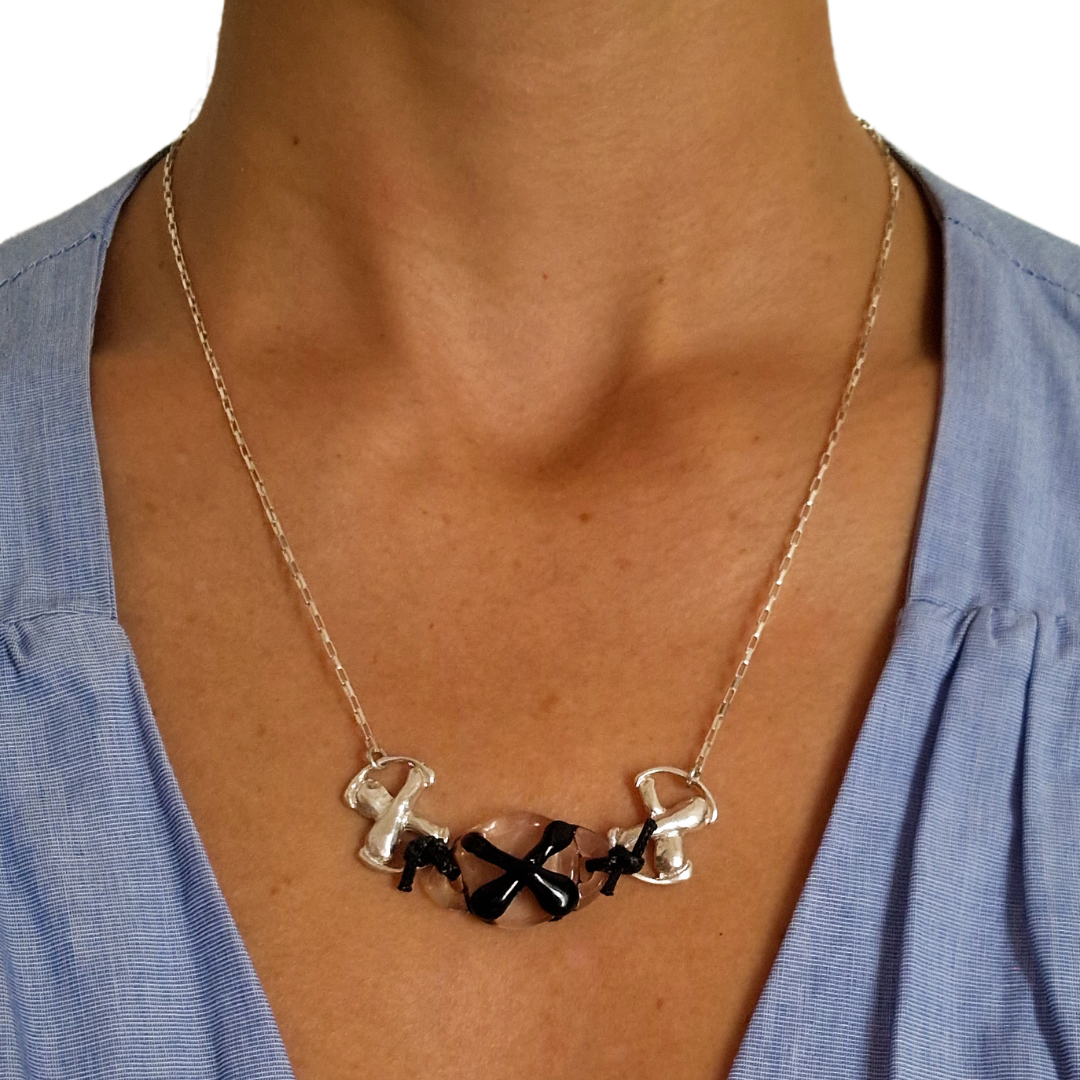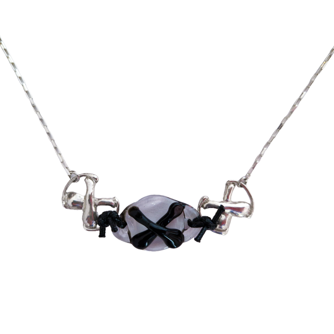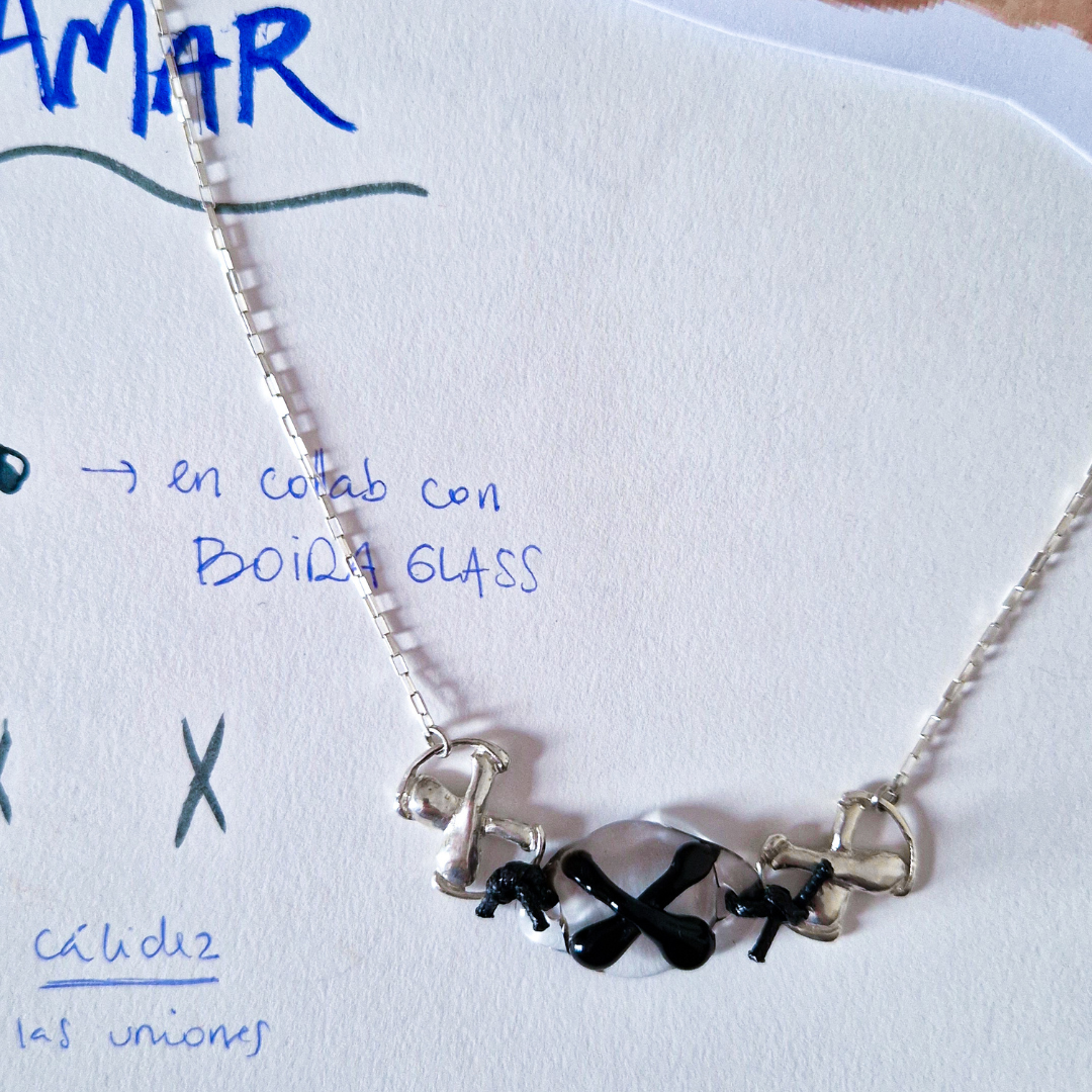 Colgante artesanal en plata de ley reciclada, vidrio borosilicato y nuditos de hilo encerado de aspecto cuero, creados en colaboración con Boira Glass, marca artesanal valenciana afectada por la DANA.