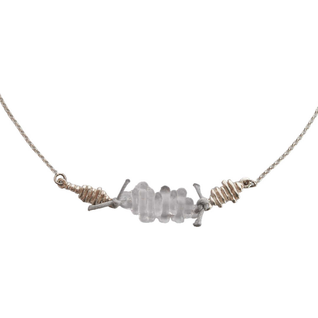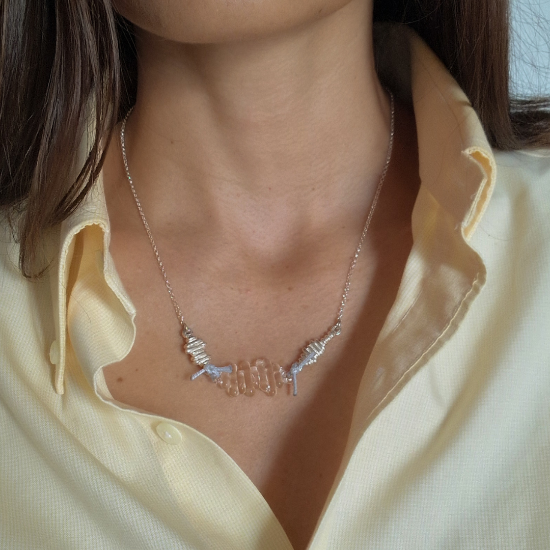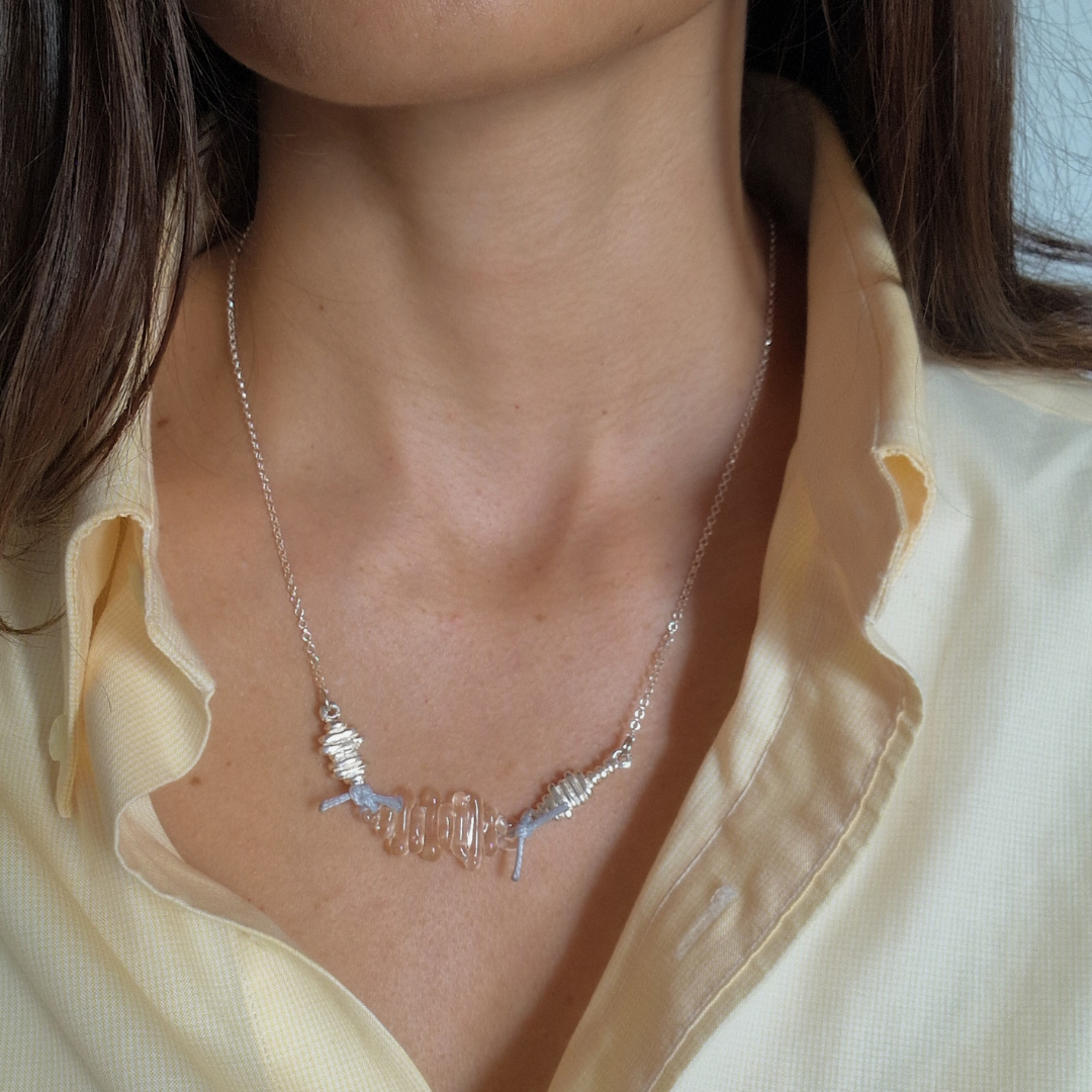 Colgante artesanal en plata de ley reciclada, vidrio borosilicato y nuditos de hilo encerado de aspecto cuero, creados en colaboración con Boira Glass, marca artesanal valenciana afectada por la DANA.