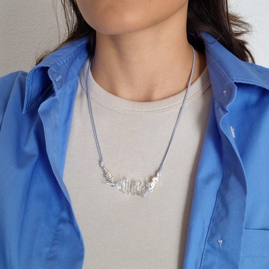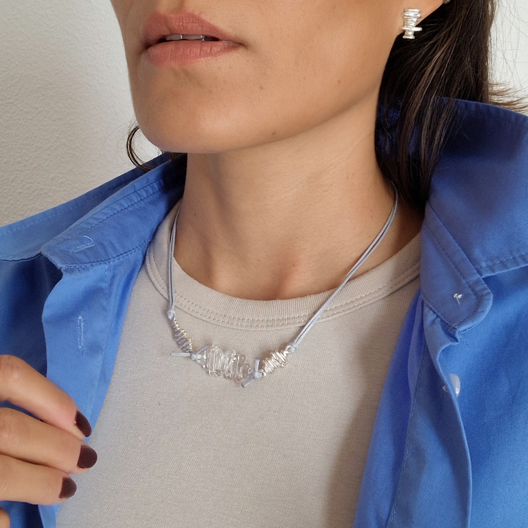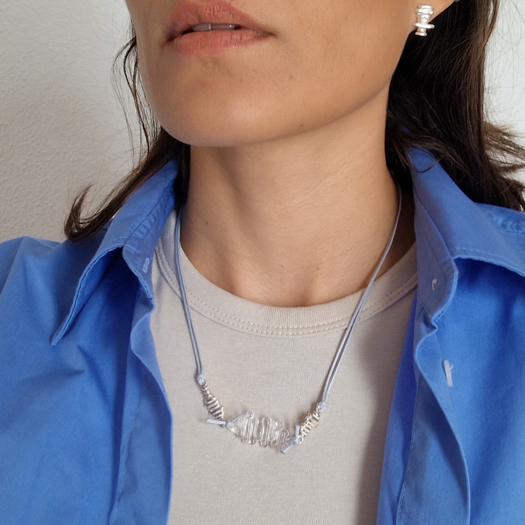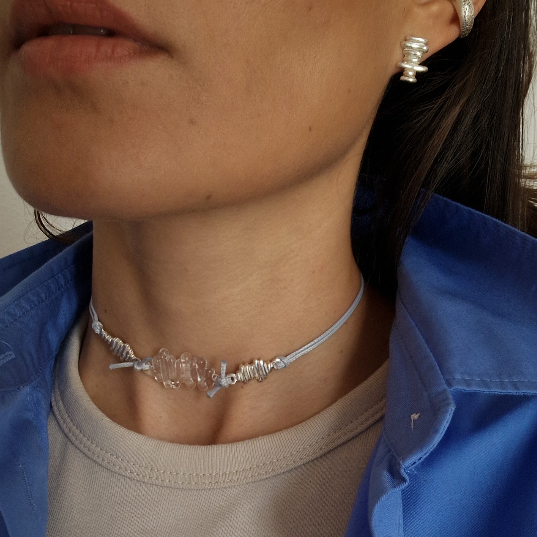 Gargantilla artesanal en plata de ley reciclada, vidrio borosilicato y nuditos de hilo encerado de aspecto cuero, creados en colaboración con Boira Glass, marca artesanal valenciana afectada por la DANA.
