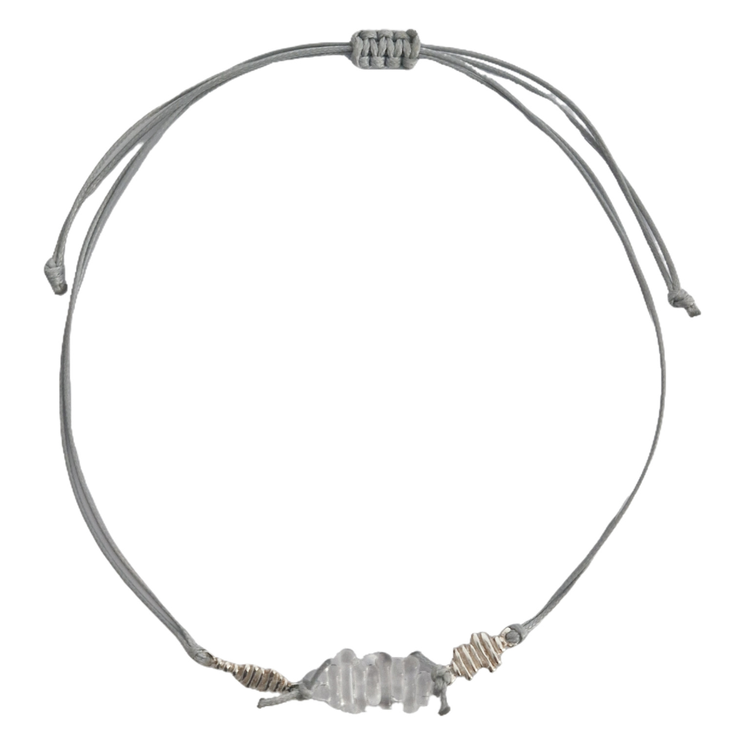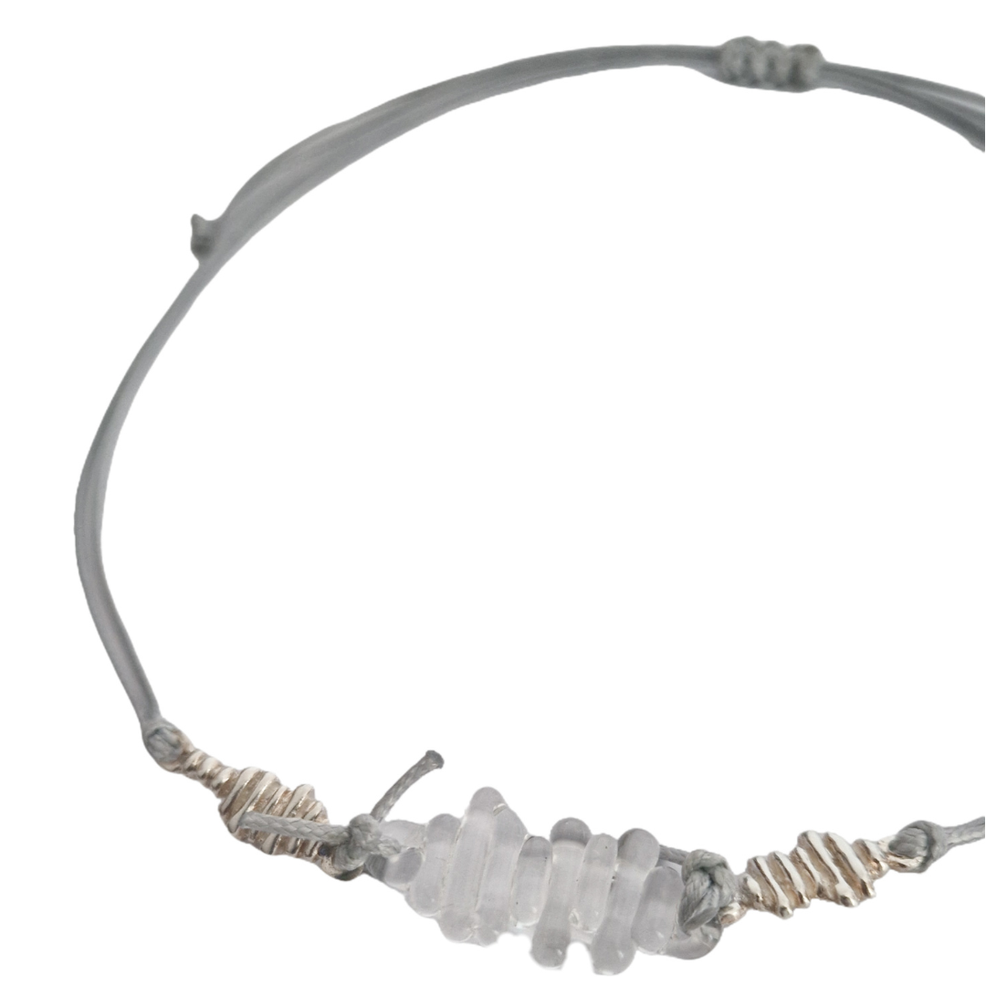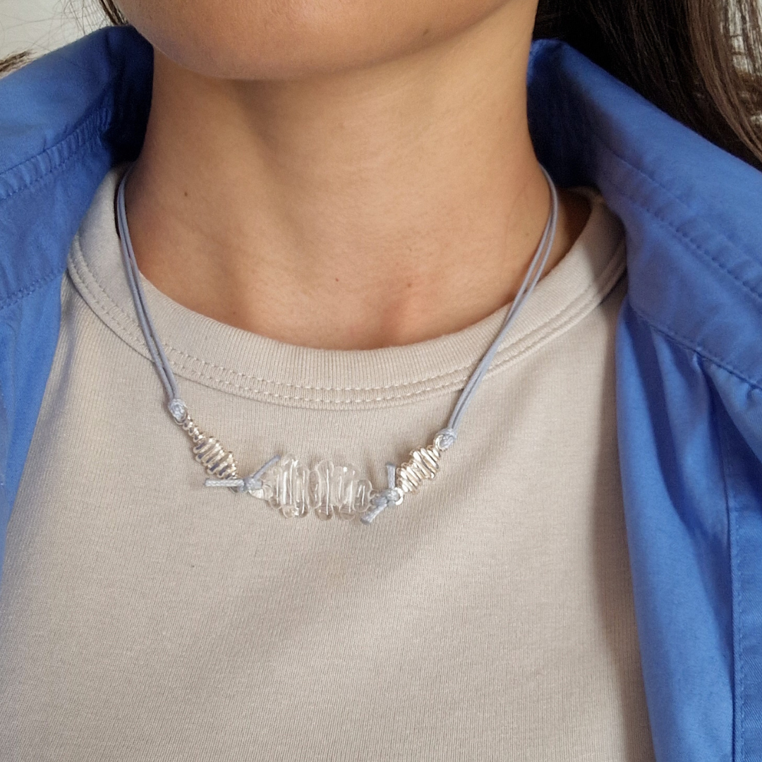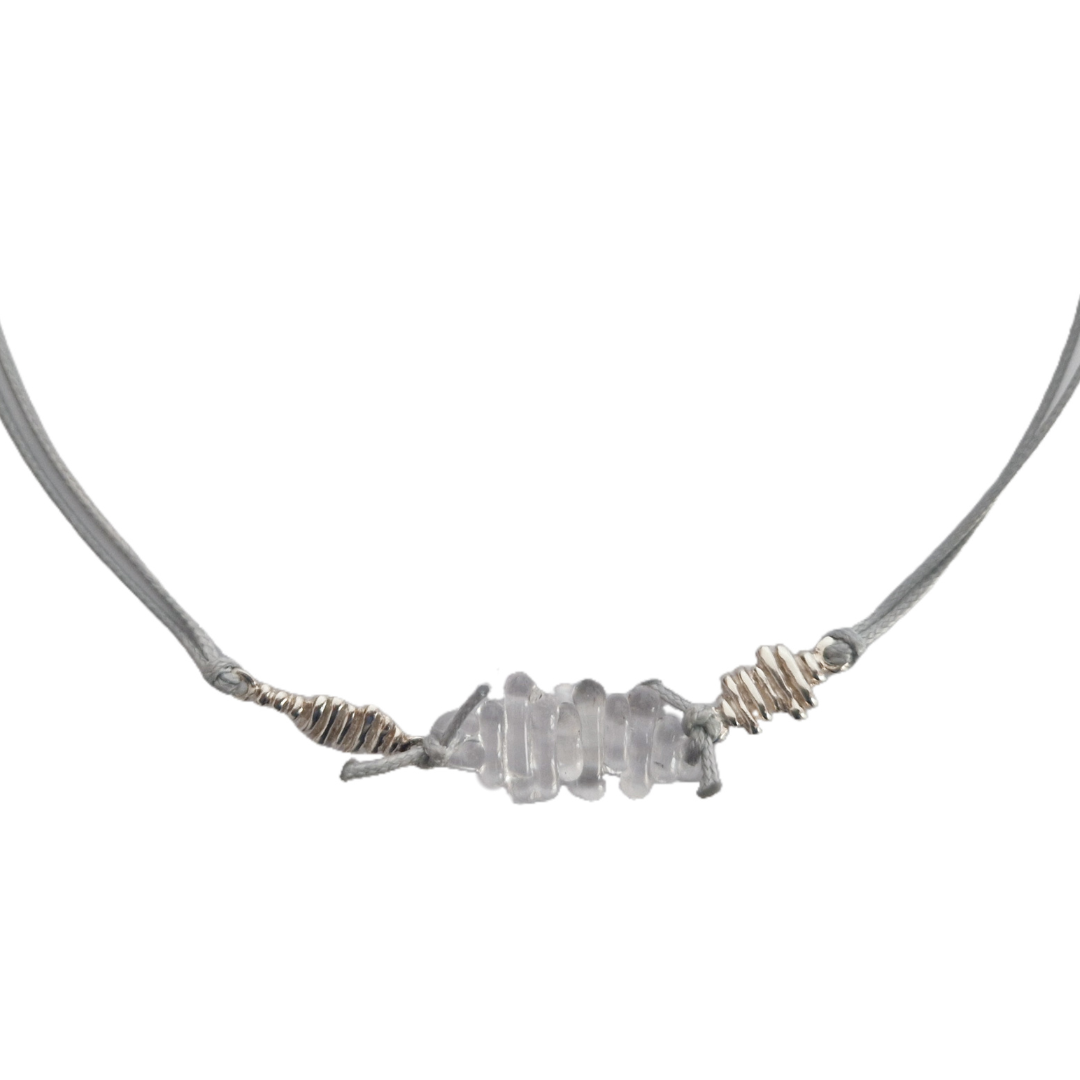 Gargantilla artesanal en plata de ley reciclada, vidrio borosilicato y nuditos de hilo encerado de aspecto cuero, creados en colaboración con Boira Glass, marca artesanal valenciana afectada por la DANA.