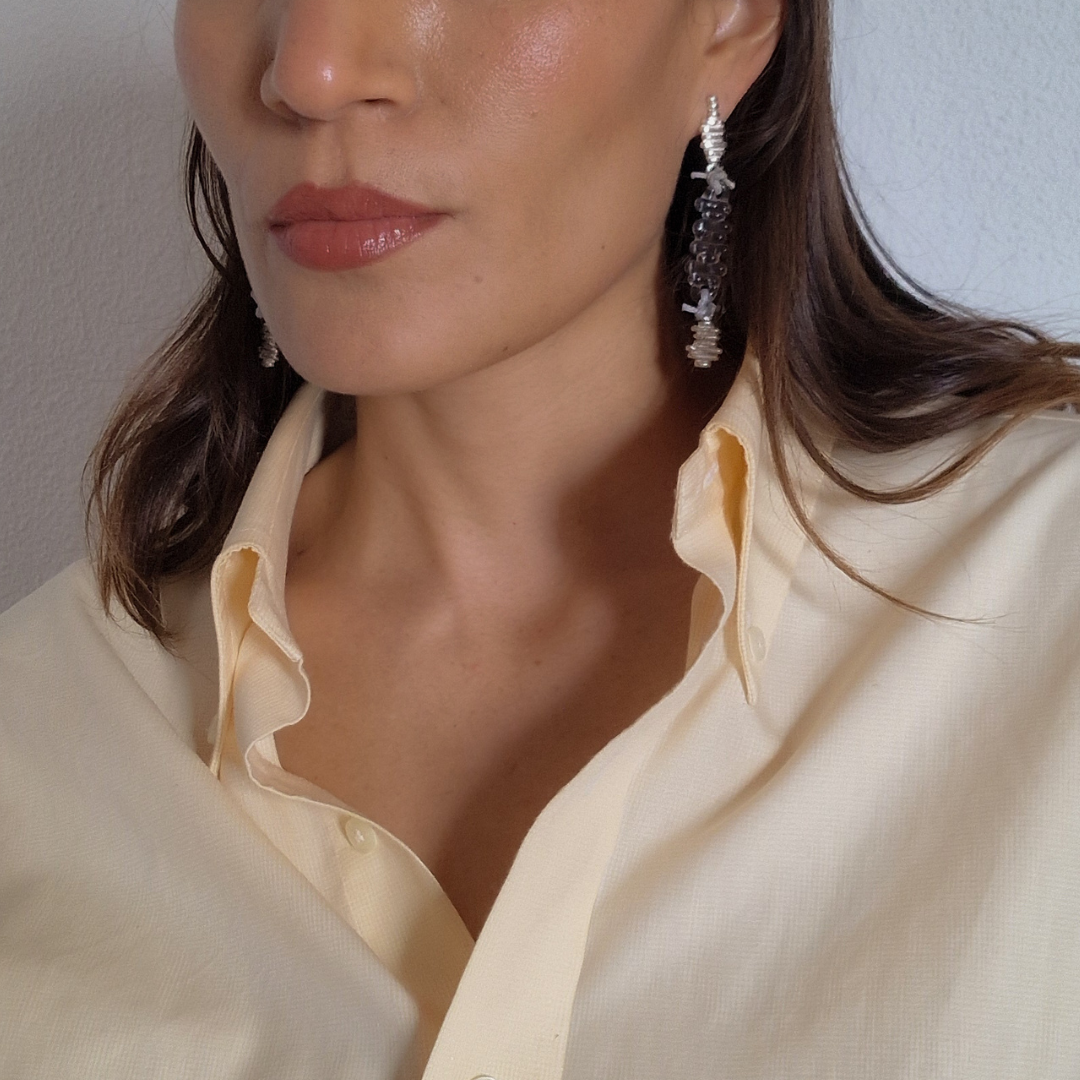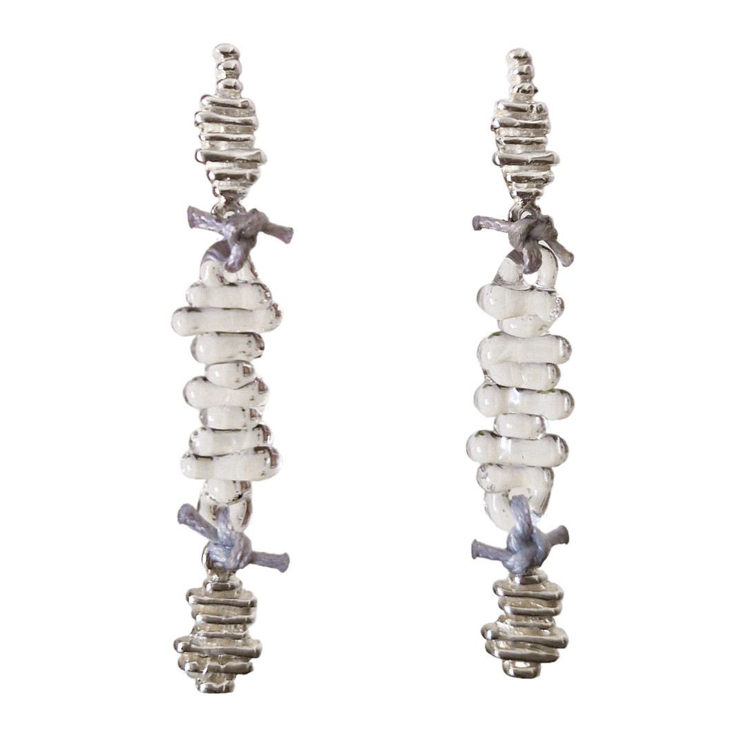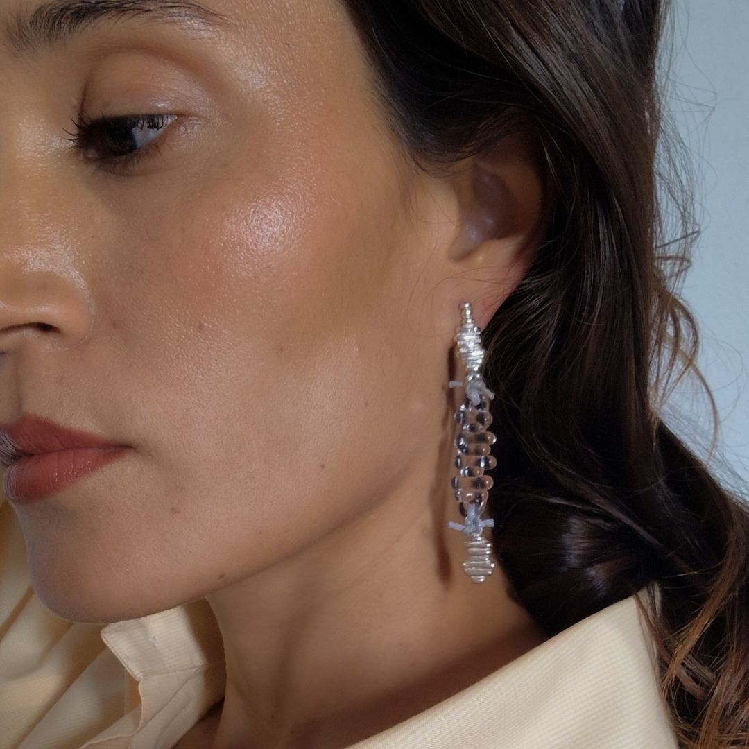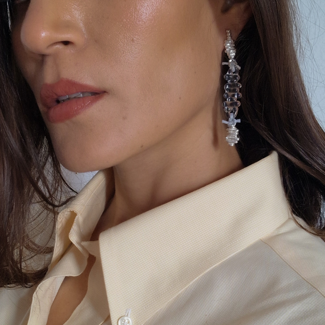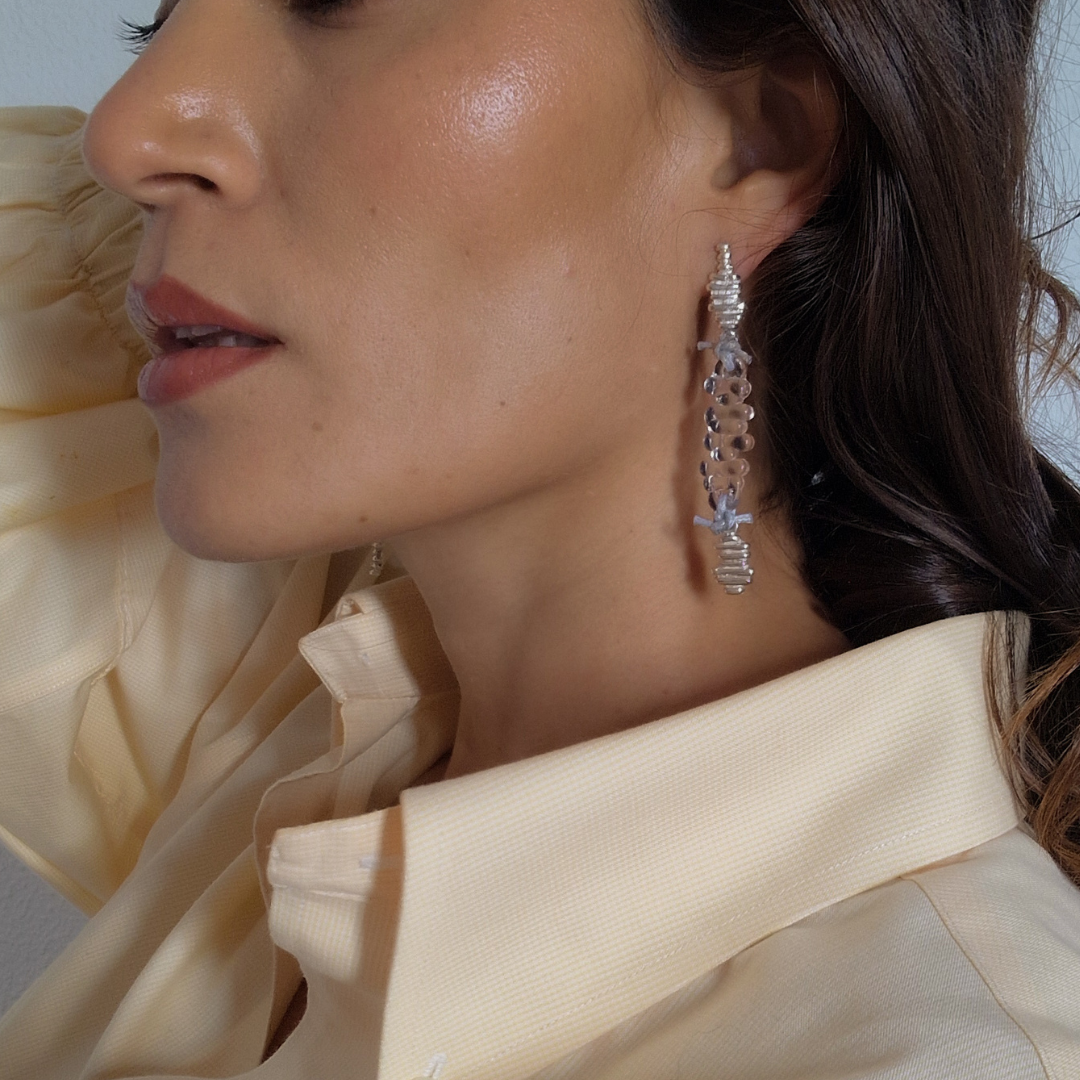 Pendientes artesanales en plata de ley reciclada, vidrio borosilicato y nuditos de hilo encerado de aspecto cuero, creados en colaboración con Boira Glass, marca artesanal valenciana afectada por la DANA.