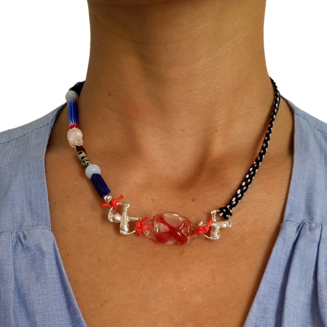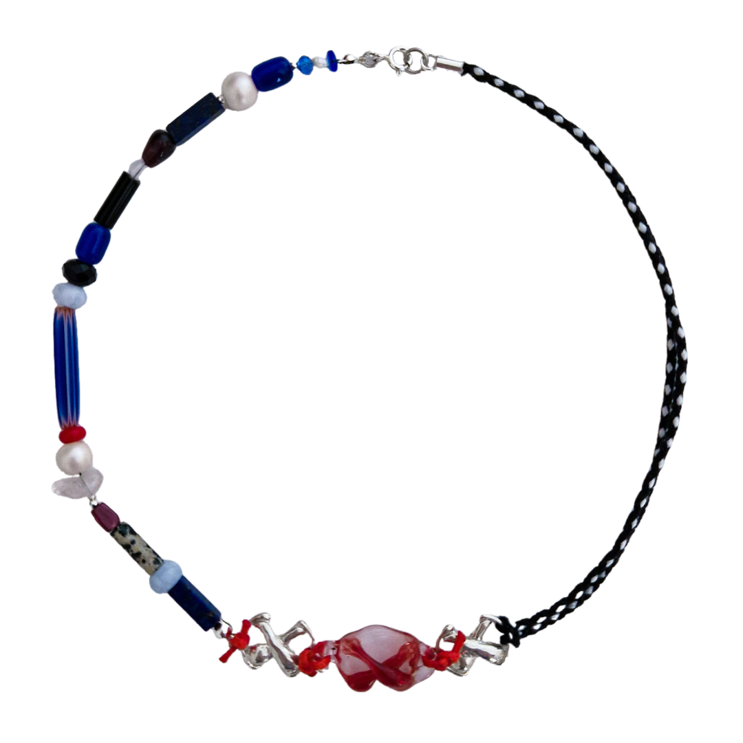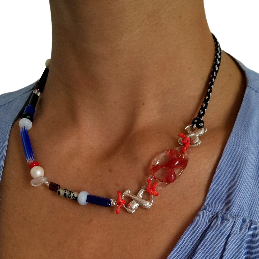 Gargantilla artesanal en plata de ley reciclada, vidrio borosilicato y nuditos de hilo encerado de aspecto cuero, creados en colaboración con Boira Glass, marca artesanal valenciana afectada por la DANA.